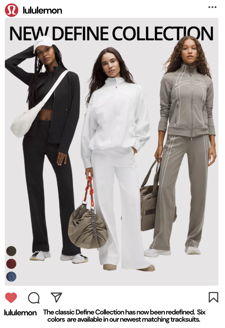 In my audit, I suggested that Lululemon focus more on product-specific posts and collection drops. This mock-up is a follow-up of one of my takeaways, being the brand experiences higher engagement through product-focused content. This post introduces followers to the newly launched Define Collection. I also followed the brand’s minimalist and neutral aesthetic to match their overall branding and social media presence.