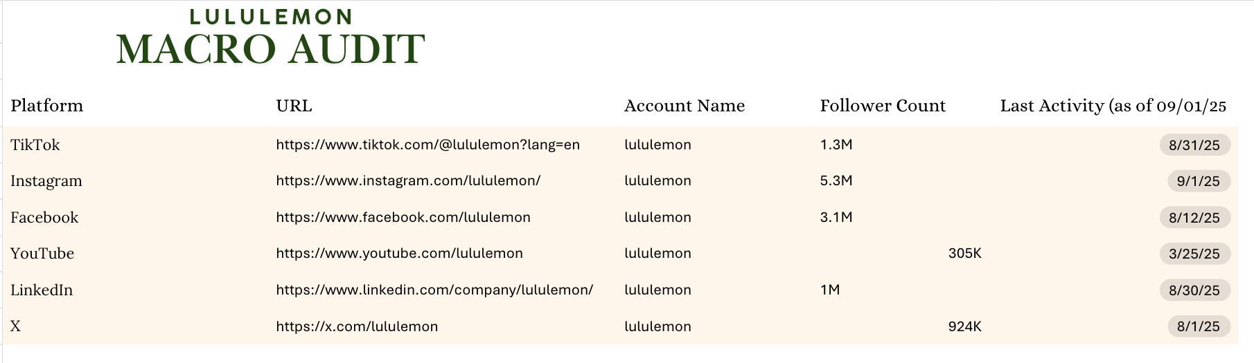 Before creating my designs, I dove into Lululemon’s social media strategy from both a broad and detailed perspective. I began by analyzing Lululemon’s social presence through both a macro and micro audit.